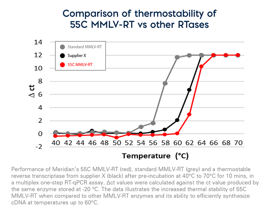 Meridian’s 55C MMLV-RT is a highly robust, thermostable reverse transcriptase, ideal for cDNA synthesis from RNA with a high secondary structure such as viral RNA genomes.