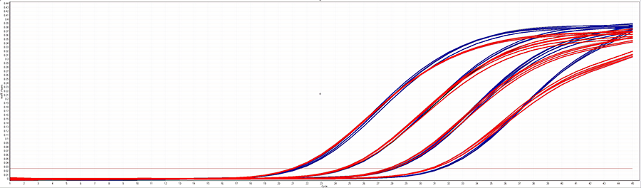 A 10-fold serial dilution of human genomic DNA amplified with four different probes, both in singleplex reactions (blue line) and quadruplex reaction (red line) using dATP, dCTP, dGTP and dTTP in lithium salt. The results illustrate the same high sensitivity, excellent reproducibility and Ct values for both the singleplex and multiplex reactions with no reduction of efficiency often associated with multiplexing.