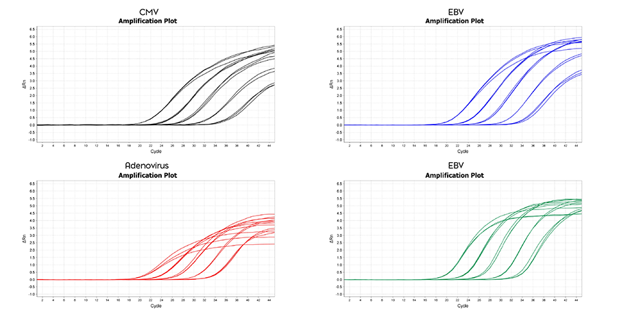 Three viral sequences, Cytomegalovirus (CMV) Adenovirus, Epstein-Barr Virus (EBV) and a DNA Extraction Control were amplified with equal efficiency from synthetic DNA templates with -Ready™ qPCR Mix in a quadruplex qPCR probe assay. The result illustrates that all three viruses were amplified with high efficiency and sensitivity, demonstrating the ability of Lyo-Ready qPCR Mix to detect low-copy number DNA targets simultaneously from a single sample.